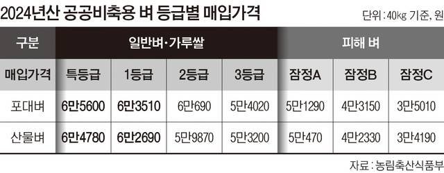 공공비축미 매입가격은 수분함량·제현율 등을 기준으로 나눈 등급에 따라 조금씩 다르다. 특등급은 40㎏ 기준 6만5600원, 2등급은 6만690원, 3등급은 5만4020원이다. 가루쌀(분질미) 매입가격도 일반벼와 동일하다.