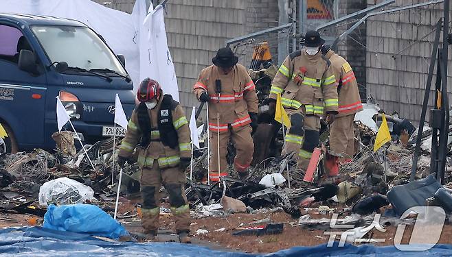(무안=뉴스1) 김성진 기자 = 30일 오전 전남 무안국제공항에서 소방대원들이 전날 발생한 제주항공 여객기 충돌 폭발 사고 잔해를 수색하고 있다. 2024.12.30/뉴스1
