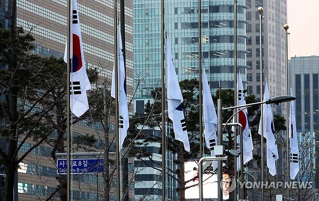 (서울=연합뉴스) 최재구 기자 = 30일 서울 종로구 정부서울청사 담장에 전남 무안국제공항에서 발생한 제주항공 참사 희생자를 애도하는 조기가 걸려 있다. 최상목 대통령 권한대행 부총리 겸 기획재정부 장관은 "정부는 1월 4일 24시까지 7일간을 국가애도기간으로 정한다"고 밝혔다. 2024.12.30