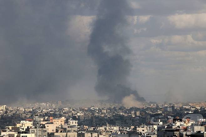 (가자 AFP=뉴스1) 우동명 기자 = 29일(현지시간) 팔레스타인 가자 지구에서 하마스와 전쟁 중인 이스라엘 군의 포격을 받아 검은 연기가 솟아 오르고 있다. 2024.12.30
