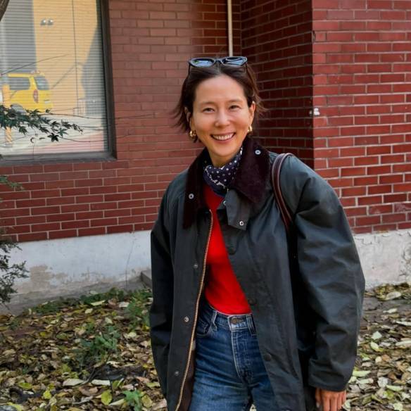 와인 컬러의 워크 재킷과 롱부츠를 매치한 오눅. 이렇게 워크 재킷을 활용하면 심플한 룩에도 산뜻한 포인트를 줄 수 있다는 사실!