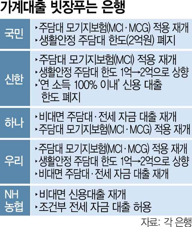 하나은행은 내년 대출 실행 건에 한해 비대면으로 주담대와 전세대출을 다시 취급하고 있다. 우리은행은 모기지보험 가입 제한을 해지하고 타행 대환 취급 제한도 내년부터 풀기로 했다. 생활 안정 자금 목적의 주담대 한도도 1억 원에서 2억 원으로 상향 조정한다. 아울러 이달 23일부터 주담대와 전세대출의 비대면 판매도 재개했다. NH농협은행은 이날부터 비대면 신용대출 판매를 재개하고 내년 실행 건부터 조건부 전세대출도 다시 취급한다.