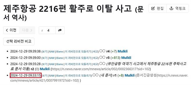 | ▲ 실제로 일부 온라인 커뮤니티에서는 이번 참사와 관련된 나무위키의 문서가 참사 이전에 생성되었다는 음모론이 제기되고 있다. 하지만 이 역시 사실과 다르다. 해당 문서의 생성 기록을 살펴보면 29일 오전 9시 33분 15초에 처음 생성되었음을 확인할 수 있다. |