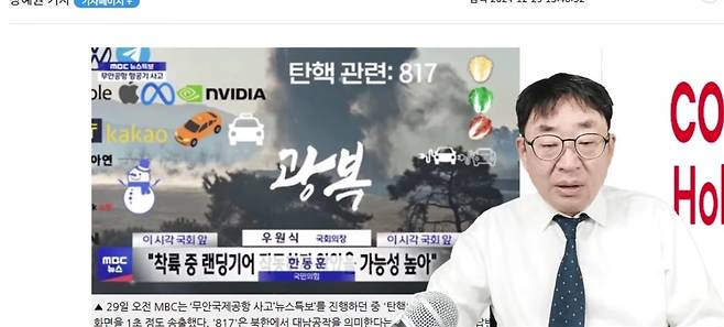 | ▲ 신혜식씨는 29일 "무정부 무안 참사!"라는 제목의 영상에서 MBC가 참사를 보도하던 중 순간 '탄핵 관련:817' 등의 문구가 적힌 화면이 잠시 방송에 노출된 것에 대해 '북한의 대남공작 지령인 817 지령이 존재한다'는 내용의 한 인터넷 언론의 기사를 소개했다. |