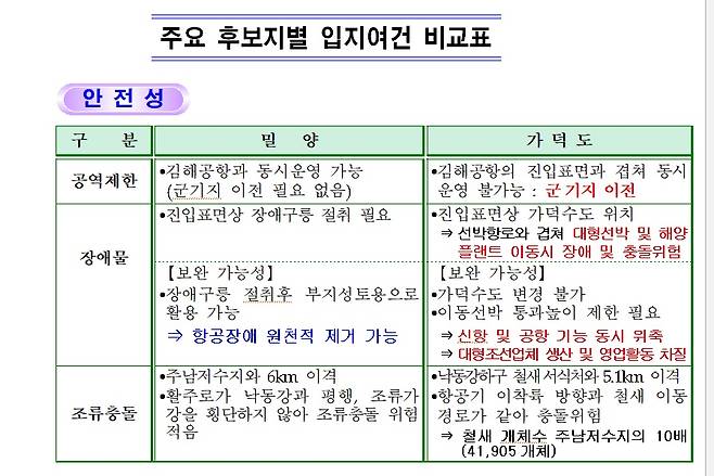 | ▲ 동남권신공항 후보지로 거론되었던 밀양과 가덕도의 입지여건 비교표. 이 자료에 보면 '조류 충동' 가능성이 제기되어 있다. |