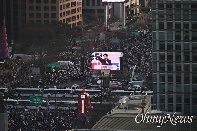 | ▲ 국민의힘 윤상현 의원이 28일 오후 서울 광화문네거리에서 열리는 전광훈 목사 주도 ‘윤석열 대통령 탄핵 결사반대’ 보수단체 집회에서 연설하고 있다. |