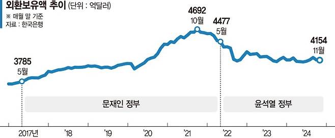 한은에 따르면 지난달 말 우리나라 외환보유액은 4153억9000만달러로 집계됐다. 외환보유액은 2021년 10월 4692억1000만달러로 역대 최대를 기록한 뒤 이후 감소세를 지속해왔다. 특히 윤석열 정부가 출범한 2022년 5월 이후 지난달 말까지 300억달러 이상 축소됐다. 외환보유액 규모만 보면 지난 10월 말 기준으로 중국, 일본, 스위스, 인도, 러시아, 대만, 사우디아라비아, 홍콩에 이어 세계 9위 수준이다.