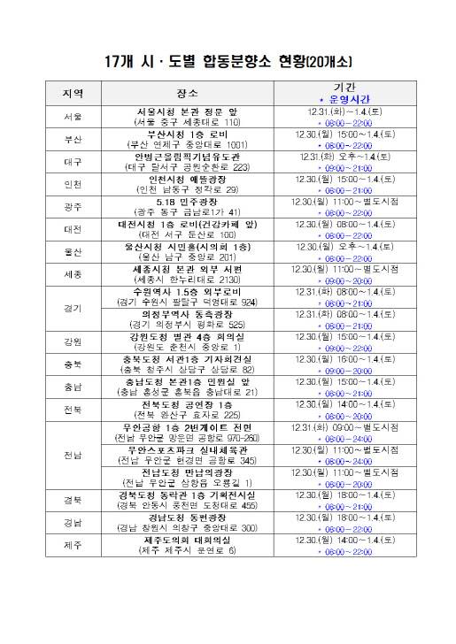 '제주항공 여객기 참사' 전국 20개 합동분향소 위치는