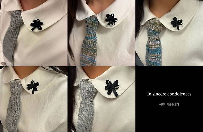 이날 미리 예정된 해외 일정에 오른 뉴진스 멤버들이 각자 셔츠 옷깃에 검은 꽃을 달아 추모의 뜻을 전했다.