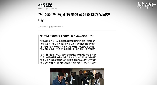 2023년 11월 23일 자 <자유일보> 기사에는 '콩고민주공화국 사람들이 2020년 4.15 총선 직전에 한국을 방문한 것이 콩고의 2018년 부정선거 논란과 관련이 있는 것'처럼 보도했다. 그러나 실제로 콩고 관계자들이 한국을 방문한 시점은 2020년이 아니라, 2013년 4.24 재보궐 선거 때였다.