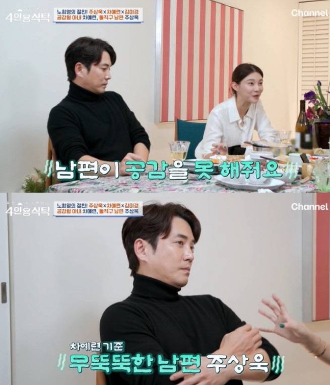 차예련은 "공감 능력이 없다. 내가 슬퍼하면 같이 슬퍼해주고 힘들어하면 '힘들어?' 해주면 좋은데 '왜 힘들어?'라고 한다"고 하자, 주상욱은 억울한 듯 "아니. 또 공감 능력이 없으니까 내가 무슨 어느 한 쪽에 장애가 있는 것처럼 들릴 수 있는데 아니다. 제가 아내보다 어른이고 더 많이 살았으니까.."라고 해명했다.