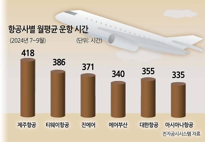 다른 LCC인 진에어의 올해 3분기 월평균 운항 시간은 371시간, 티웨이항공은 386시간, 에어부산 340시간으로 집계됐다. 양대 FSC인 대한항공의 월평균 운항 시간은 355시간, 아시아나항공은 335시간이다.