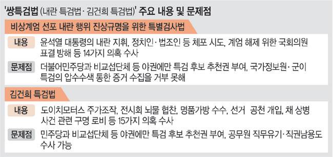 정부 고위 관계자는 31일 문화일보와 통화에서 “쌍특검법에 대해선 거부권을 행사하겠다는 방침”이라면서도 “헌법재판관은 막판까지 임명 여부를 고심할 것”이라고 밝혔다. 최 권한대행은 이날 열리는 국무회의에서 위헌·위법적 요소가 있는 쌍특검법에 대해선 기존의 정부 방침에 따라 일관되게 수용할 수 없다는 입장을 분명히 할 것으로 전해졌다. 두 특검법 모두 민주당 등 야당이 특검 2명을 추천하도록 명시돼 사실상 야당이 특검을 임명한다는 지적을 받아왔다. 또 별건 수사가 가능하고, 수사 대상이 광범위하게 설정돼 무분별한 수사가 이뤄질 수 있다는 비판도 제기된다. 여당인 국민의힘에서도 최 권한대행에게 거부권 행사를 요구하고 있다.