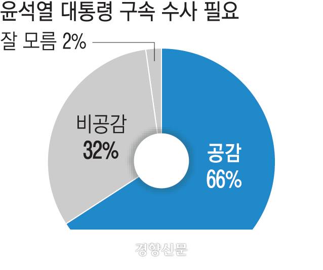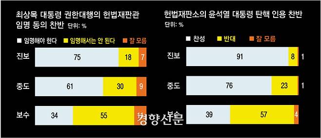 경향신문이 여론조사기관 메타보이스에 의뢰해 지난 28~29일 전국 18세 이상 성인 1020명을 대상으로 실시한 조사에서 응답자 69%는 헌법재판소의 윤 대통령 탄핵 인용에 찬성했다. ‘매우 찬성한다’는 응답이 58%로 조사됐다. 탄핵 반대는 28%에 그쳤다. 중도층도 76%가 탄핵 인용을 지지했다. 윤 대통령 구속 수사 필요성에 공감한다는 응답은 66%로 나타났다.
