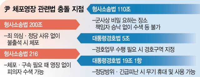 사정 기관이 윤 대통령의 신병을 강제로 확보하는 데 법적 걸림돌로 제기되고 있는 건 형사소송법 조항상 충돌이다. 해당 법 200조(영장에 의한 체포)에 따르면 피의자가 죄를 범했다고 의심할 상당한 이유가 있고, 정당 사유 없이 출석 요구에 응하지 않거나, 그러한 우려가 있을 때 검사는 지방법원 판사로부터 체포영장을 발부받아 체포할 수 있다. 또 체포 또는 구속의 경우 필요할 시 영장 없이 가옥·건조물 등 내에서 피의자 수색이 가능하다. 반면 같은 법 110조에서는 ‘군사상 비밀을 요하는 장소는 그 책임자의 승낙 없이는 압수 또는 수색할 수 없다’고 규정한다. 한남동 관저 등은 윤 대통령이 머물고 있다고 추정되는 곳이자 1급 보안 시설이다. 이 경우 수색 및 체포영장이 있더라도 체포를 위한 수색을 위해서는 경호처장의 허가가 필요하다.