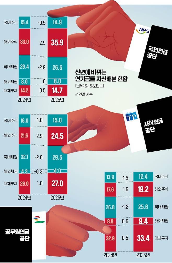 31일 금융투자업계에 따르면 국민연금, 사학연금공단, 공무원연금공단은 일제히 올해 해외 주식 비중을 늘리기로 했다. 국민연금은 지난해 33%에서 올해 35.9%로 2.9%포인트 높인다. 해외 주식에 약 58조원이 추가 집행될 전망이다. 이에 따라 올해 말에는 보유 해외 주식이 422조원어치에 달하게 된다. 사학연금과 공무원연금도 올해 해외 주식 비중을 각각 2.9%포인트, 1.6%포인트 높인다.