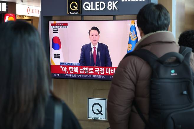 | ▲ 12일 오전 서울역에서 시민들이 윤석열 대통령 담화를 TV로 보고 있다. |