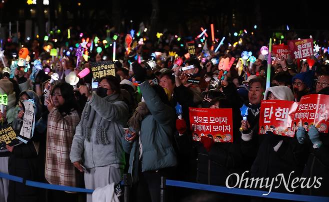 | ▲ 14일 오후 서울 여의도 국회 앞에서 윤석열 대통령 탄핵소추안 2차 표결이 재적의원 300명 중 204명 찬성, 85명 반대, 기권 3표, 무효 8표로 가결되자, 시민들이 환호하며 기뻐하고 있다. |