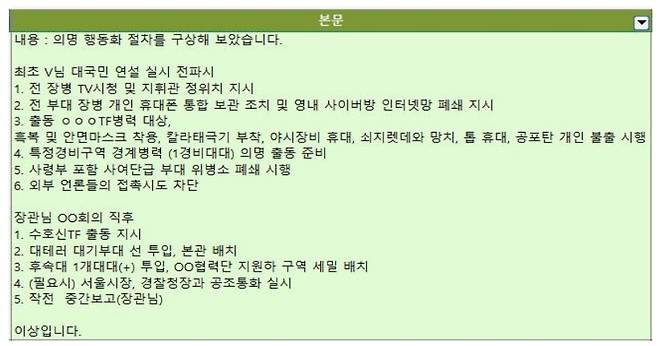 이 전 사령관은 김 전 장관이 주재한 화상회의 직후 계획으로는 ▲수호신TF 출동 지시 ▲대테러 대기부대 선 투입, 본관 배치 ▲후속대 1개 대대 투입, OO협력단 지원하 구역 세밀 배치 등을 적었다. ▲(필요시) 서울시장, 경찰청장과 공조통화 실시 ▲작전 중간보고(장관님)도 언급했다.