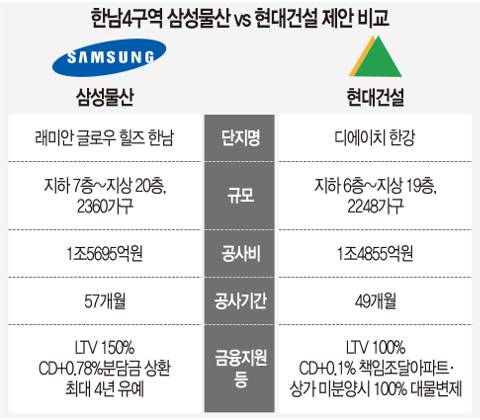 삼성물산은 조합원 100% ‘한강 조망권’ 보장을 포함해 주택담보인정비율(LTV) 150%에 최저 이주비 12억원 보장, 조합원 분담금 최장 4년 유예를 제안했다. 또 필수사업비와 추가이주비 등 약 3조원 이상의 전체 사업비를 양도성예금증서(CD) 금리+0.78% 고정금리 조달, 착공 전 물가인상에 따른 공사비 증액을 314억원까지 시공사 부담 등도 약속했다.
