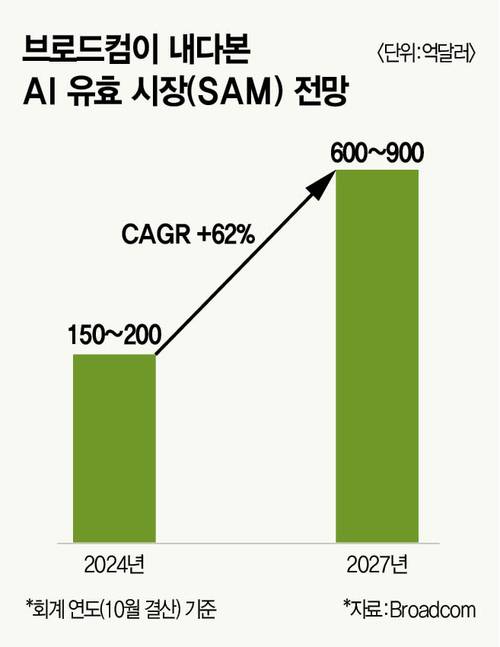 양 사는 향후 ASIC 시장 전망을 긍정적으로 내다본다. 브로드컴은 최근 4분기 실적 발표 자리에서 ASIC 매출을 올릴 수 있는 ‘유효 시장(SAM)’ 규모가 빠르게 성장해 2027년 600억~900억달러에 이를 것으로 전망했다. 2024년 ASIC 부문 SAM 규모는 150억~200억달러다. 브로드컴은 ASIC 시장을 앞으로 3년 동안 약 4배 커질 ‘블루오션’으로 내다본 셈이다.