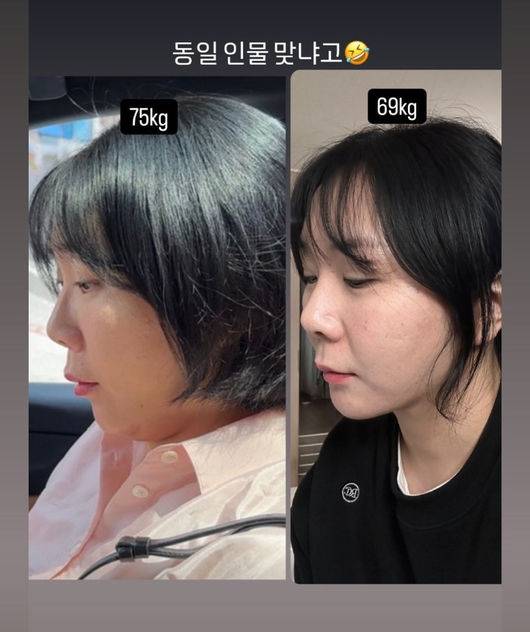 허안나는 "동일 인물 맞냐고"라고 글을 남기며 75kg일 때 모습과 69kg 모습을 비교 사진으로 공개했다.