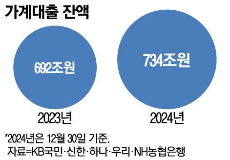 5대 시중은행(KB국민·신한·하나·우리·NH농협은행)의 2024년 가계대출 잔액이 42조원 가까이 늘면서 734조원을 돌파했다.