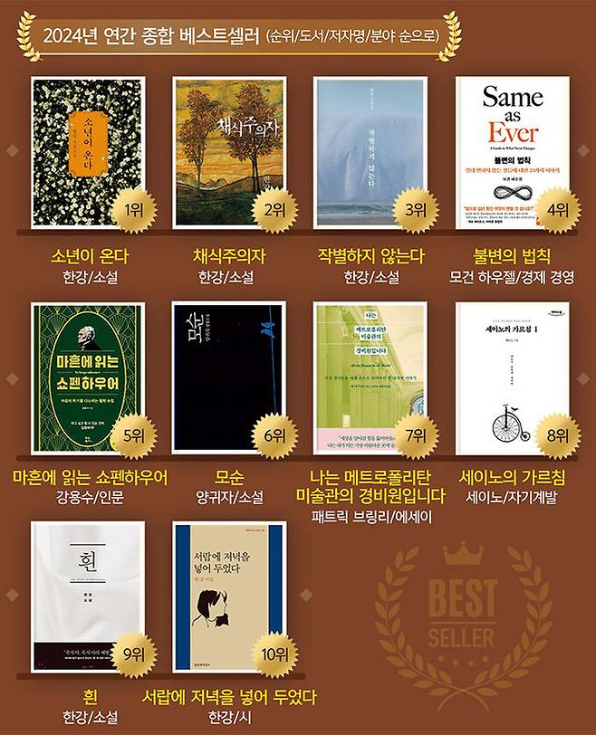 2024년 가장 많이 팔린 책을 한강의 장편 ‘소년이 온다’가 차지하고 연간 베스트셀러에 5종이 오를 정도로 서점가에서도 한강 신드롬이 거셌다. 교보문고가 연말 발표한 ‘2024년 연간 도서판매 및 베스트셀러 분석’에 따르면, 한강의 장편 ‘소년이 온다’는 노벨문학상 수상 이후 판매가 폭증하면서 연간 종합 베스트셀러 1위를 차지했다. 더구나 2015년부터 10년간 종합 1위를 한 도서와 비교했을 때에도 가장 많은 판매고를 기록한 것으로 조사됐다. 한강의 작품은 연간 베스트셀러 10위 안에 무려 5종이나 포함됐고, 한강의 소설들은 소설 분야 베스트셀러 30위 가운데 무려 7종이나 오르기도 했다.