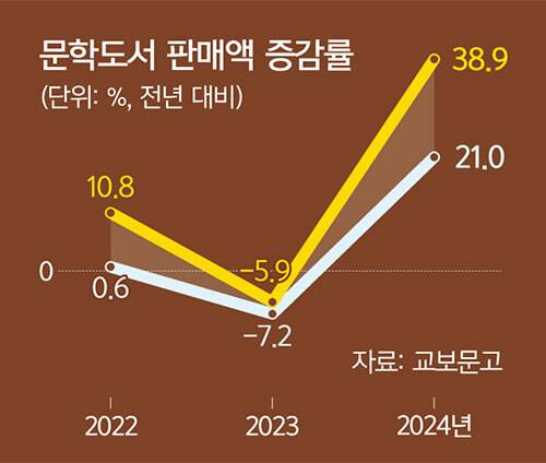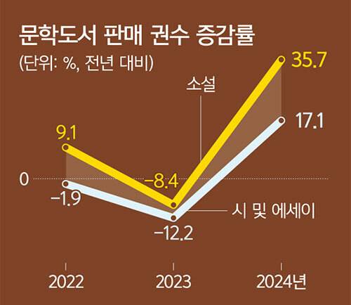 이 같은 전망은 한강 작품을 제외한 2024년 문학도서 판매 신장률을 살펴보면 유추할 수 있다. 즉 2024년 소설 판매 신장률은 한강의 노벨문학상 수상 전에는 5.8%에 그쳤지만 수상 이후에는 무려 30%로 급증했고, 시·에세이 분야 역시 수상 전 12.6%에서 수상 후 26.6%로 크게 증가한 것으로 나타나 한강 효과가 한강 작품뿐만 아니라 소설과 시 분야 전반으로 확산된 것을 알 수 있기 때문이다.