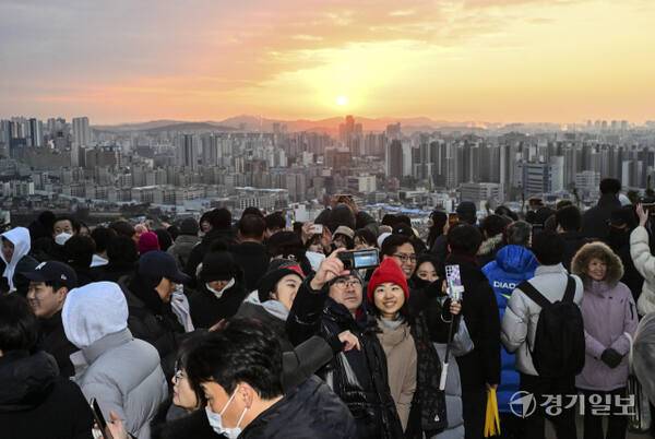 2025년 을사년(乙巳年) 첫날인 1일 오전 수원특례시 팔달구 서장대에 시민들이 새해의 첫 일출을 저마다의 방법으로 감상하고 있다.