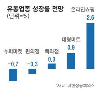 지난달 대한상공회의소가 소매 유통업체 300개를 대상으로 실시한 '2025년 유통산업 전망조사 결과'에 따르면 새해 국내 소매 유통시장 성장률은 0.4%로 간신히 역성장을 면할 것으로 전망된다. 이는 코로나19 팬데믹이 불어닥친 2020년(-1.2%) 이후 가장 낮은 수치다. 응답 업체 66.3%는 내년 유통시장이 올해보다 부정적일 것으로 내다봤는데, 그 이유(복수 응답)로 63.8%가 소비심리 위축을 꼽았다. 새해 유통업계 성장률 전망치는 쿠팡을 위시한 온라인 쇼핑 업계가 2.6%로 가장 높았고 대형마트(0.9%)와 백화점(0.3%)은 0%대에 그칠 것으로 예상되고 있다. 편의점(-0.3%)과 슈퍼마켓(-0.7%)은 역성장을 면하기 어려울 전망이다.