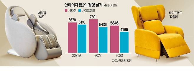 두 회사가 상대 기업의 주력제품 기능을 베낀 신제품을 내놓은 데는 실적 감소에 따른 위기감이 자리 잡고 있다. 바디프랜드 매출은 2021년 6110억원을 정점으로 2022년 5436억원, 2023년 4196억원으로 줄었다. 기존 제품군으론 더 이상 시장 저변을 확대하기 어렵다는 판단이 작용했다. 세라젬도 마찬가지다. 1999년 의료기기 안마베드로 시작한 이 회사는 2020년 매출 3002억원에서 이듬해 6670억원으로 두 배 이상 커졌다. 이때 1위였던 바디프랜드를 꺾고 업계 1위에 올랐다. 2022년 매출이 최대치인 7501억원까지 늘었다가 2023년 5846억원으로 쪼그라들었다.