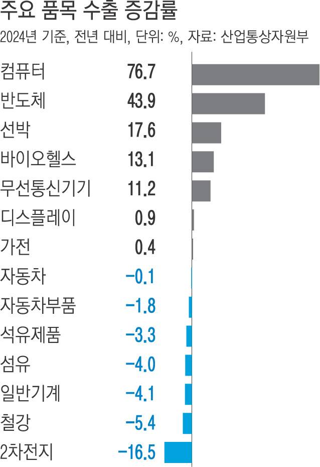 주력 품목인 반도체 수출이 역대 최대 기록을 경신하면서 전체 수출 증가를 이끌었다. 반도체는 전년 대비 43.9% 증가한 1419억달러로 기존 최대 실적인 2022년 기록(1292억달러)을 넘어섰다. 산업부는 지난해 4분기 들어 범용 메모리 가격이 하락했으나 DDR5·고대역폭메모리(HBM) 등 고부가 품목을 중심으로 수출이 확대됐다고 설명했다.