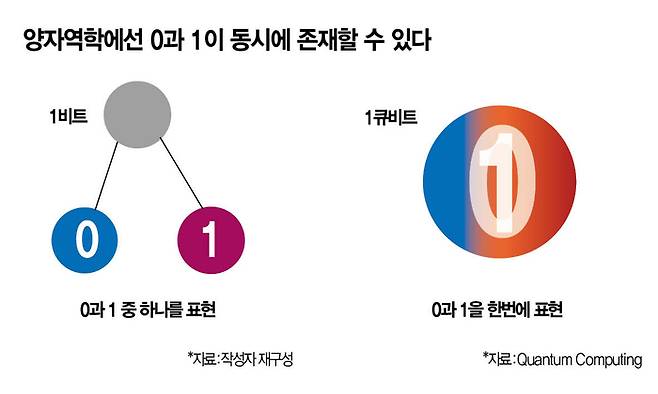 ‘A지역에서 B지역으로 가는 100가지 방법 중 가장 빠른 길을 찾아달라’고 요청했다고 가정하자. 기존 컴퓨터는 숫자를 하나하나 넣으며 연산해 정답을 찾는다. 성능에 따라 속도의 차이만 있을 뿐이다. 하지만 큐비트 단위인 양자컴퓨터에선 순식간에 끝난다. 큐비트는 양자역학적으로 중첩된, 0이면서 동시에 1인 상태다. 단 7개의 큐비트만 갖춘 양자컴퓨터도 2의 7승(乘)가지 연산을 동시 처리할 수 있다. 즉, 문제가 어려워지고 필요한 연산량이 늘어날수록 양자컴퓨터는 기존 컴퓨터 대비 우월한 성능을 보인다.