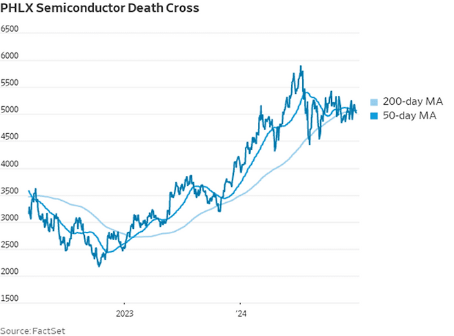 1일(현지시간) 마켓워치에 따르면, 필라델피아 반도체지수(SOX)에서 연말에 50일 이동 평균이 200일 이동 평균을 밑도는 ‘데드 크로스’가 발생했다. 이는 기본 추세의 약세 전환을 암시한다.