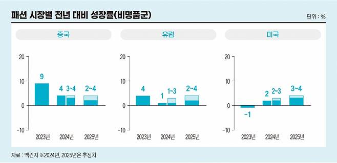 글로벌 컨설팅업체 맥킨지와 패션 전문지 비즈니스오브패션(BoF)이 발간한 보고서에 따르면 2025년 글로벌 패션 산업은 2~5% 수준의 성장에 그칠 것으로 보인다. 맥킨지는 “성장 둔화가 이어지고 있다”며 “성장할 여지는 있지만 경제적 불확실성, 지리적 격차 등이 변수다. 결과적으로 많은 브랜드에 2025년은 심판의 시간이 될 가능성이 크다”고 분석했다.