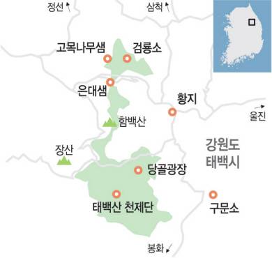 태백산은 예로부터 영험한 산이었다. 신증동국여지승람의 한 대목을 읽어보자. ‘천하의 명산은 삼한(三韓)에 많고, 삼한의 명승은 동남(東南)이 가장 뛰어나다. 동남의 거산(巨山)은 태백이 우두머리가 된다.’ 태백은 일찌감치 명산(名山)의 반열에 올랐다. 산세가 웅장하거나 아름다워서라기보다, 거기 서린 신령스럽고 영험한 기운 때문이었다.
