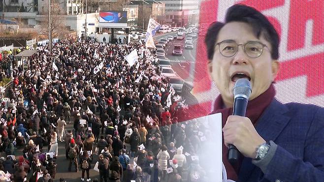 국민의힘 윤상현 의원이 윤석열 대통령 지지자들의 관저 앞 집회에 참석해 참석자들을 격려했습니다.
