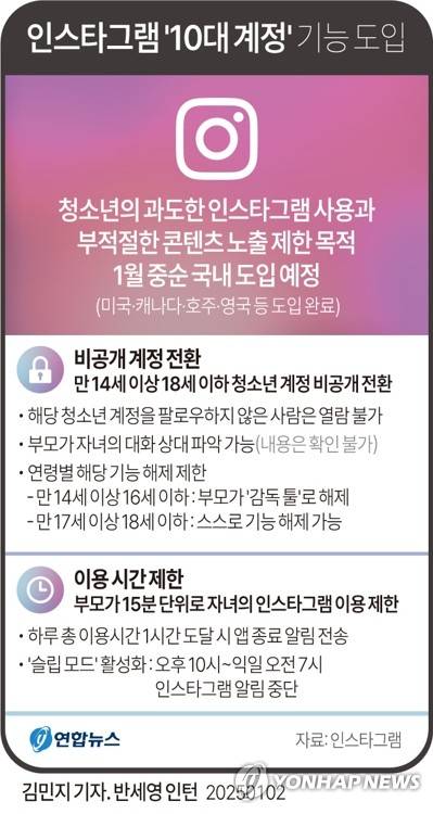 (서울=연합뉴스) 김민지 기자 = 부모가 10대 자녀의 인스타그램 이용을 제한할 수 있는 '10대 계정'(Teen Account) 기능이 이르면 이달 중순 국내 도입된다.
