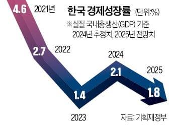 정부가 올해 성장률을 1.8%로 전망한 것은 약 2.0%로 추정되는 잠재성장률조차 달성하지 못한다는 의미다. 한국은행에 따르면 인구 고령화와 생산성 감소로 잠재성장률이 올해부터 5년간 연평균 1.8% 수준으로 내려갈 전망이다. 규제 혁파, 노동시장 구조 및 교육개혁 등을 통해 잠재성장률을 높이지 않으면 저성장이 고착화할 것이라는 우려가 나온다.