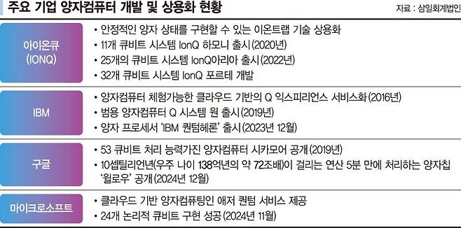 이미 주요 글로벌 기업들은 양자 기술을 활용한 다양한 결과물을 내놓고 있다. 구글은 지난해 12월 자체 개발한 양자칩 '윌로우'를 장착한 컴퓨터가 현존 최고 성능 슈퍼컴퓨터 수준을 능가했다고 발표했다. AI 반도체 선두주자인 엔비디아는 직접 양자컴퓨터를 만들지는 않지만, 그래픽처리장치(GPU) 기반 슈퍼컴퓨터 '에오스'를 통해 구글과 협력할 방침이다. 국내에서도 삼성전자가 SAIT(옛 종합기술원)에서 관련 기술을 연구하는 등 관심이 높아지고 있다.