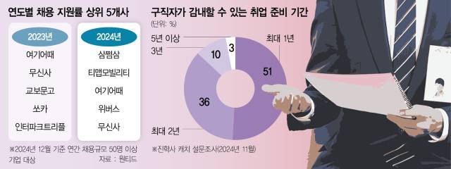 2024년 한 해 동안 취업준비생들이 가장 지원을 많이 한 회사는 삼쩜삼·티맵모빌리티·여기어때·위버스·무신사인 것으로 나타났다.