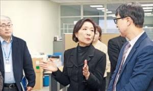 오영주 중소벤처기업부 장관(가운데)은 2일 경기 화성시에 있는 반도체 검사장비 전문 제조기업 넥스틴과 주형·금형 제조업체 한양엠텍을 찾아 애로사항을 들었다.