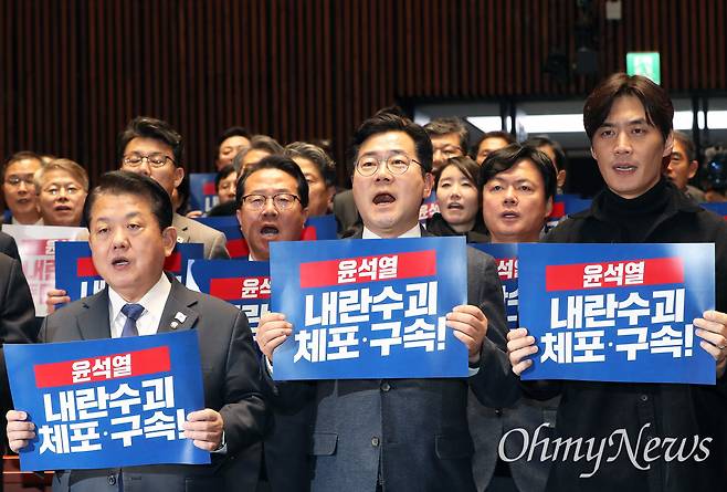 | ▲ '윤석열 내란수괴 체포·구속!' 외치는 민주당 더불어민주당 박찬대 원내대표를 비롯한 의원들이 2일 오후 서울 여의도 국회에서 열린 비상의원총회에서 '윤석열 내란수괴 체포·구속!' 구호를 외치고 있다. |