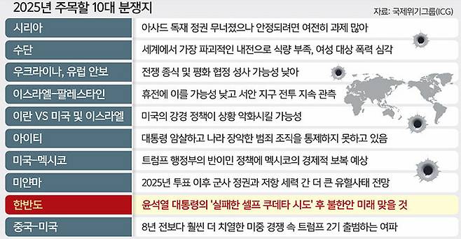 ICG는 지난 수년간 고조돼 온 한반도에서의 위기감에 주목했다. 2023년말 김정은 북한 국무위원장이 남한을 ‘적대적 두 국가’로 규정한 것, 2024년 북한군 파병 등으로 러시아와의 관계가 정점에 이른 가운데 윤석열 대통령의 12·3 비상계엄과 정국혼란, 탄핵소추안 가결로 한 해가 마무리된 것을 지적했다. 그러면서 “이런 변화로 인해 한반도는 2025년을 앞두고 긴장된 분위기가 감돌고 있다”고 한 뒤 트럼프 2기 출범까지 덮쳐 불확실성이 가중되고 있다고 설명했다.