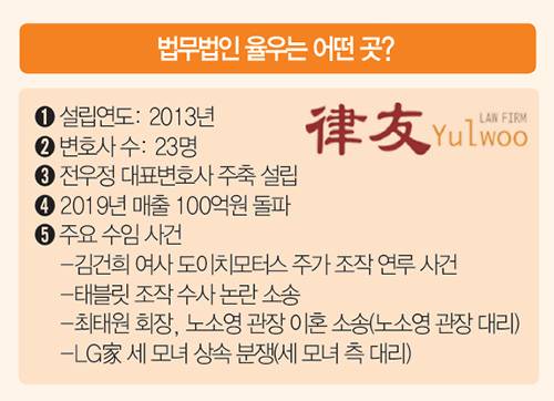 율우는 윤 대통령 변호 해프닝 이전에도 서초동에서 최근 가장 ‘핫’한 로펌으로 꼽혔다. 현 정권 아래서 굵직한 정재계 소송을 연달아 수임하며 급속도로 덩치를 키워왔기 때문이다. 특히 ‘세기의 이혼’으로 꼽힌 SK 최태원·노소영 이혼 소송, LG가 세 모녀 상속 소송 등에서 어김없이 율우의 이름이 따라붙었다. 각각 노소영 측, 구연경 측 변호인으로 이름을 올리면서 ‘회장님 킬러’라는 별칭도 붙었다.