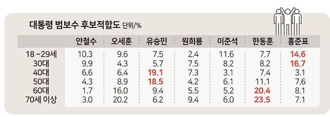 이번 여론조사의 범보수 진영 대선 후보는 안철수 국민의힘 의원, 오세훈 서울시장, 유승민 국민의힘 전 의원, 원희룡 전 국토교통부 장관, 이준석 개혁신당 의원, 한동훈 국민의힘 전 대표, 홍준표 대구시장(이상 가나다순)등 총 7명이다. 18~29세 지지율은 홍준표 대구시장 14.6%, 이준석 개혁신당 의원 11.6%, 안철수 국민의힘 의원 10.3%, 오세훈 서울시장 9.6%, 한동훈 국민의힘 전 대표 7.7%, 유승민 국민의힘 전 의원 7.5%, 원희룡 전 국토교통부 장관 2.4% 순이었다. 또, 30대에선 홍 시장이 16.7% 지지율을 보이는 등 20·30대 지지율이 상대적으로 높았다.