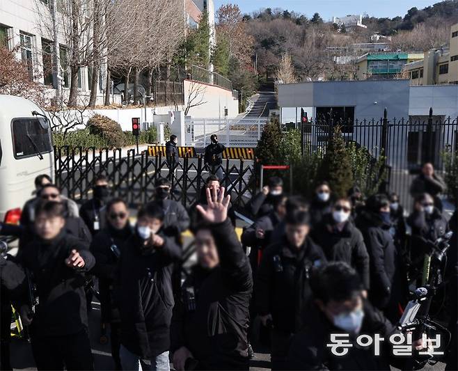 | 긴장감 도는 대통령 관저 앞 2일 오후 서울 용산구 한남동 대통령 관저 입구에서 마스크와 선글라스를 착용한 경찰이 경계 근무를 서는 가운데 한 경찰이 손을 들어 취재진의 사진 촬영을 막고 있다. 이날 관저 앞에서는 윤석열 대통령의 지지자들과 반대 진영의 집회가 함께 열려 양측이 일부 충돌하기도 했다. 양회성 기자 yohan@donga.com |
