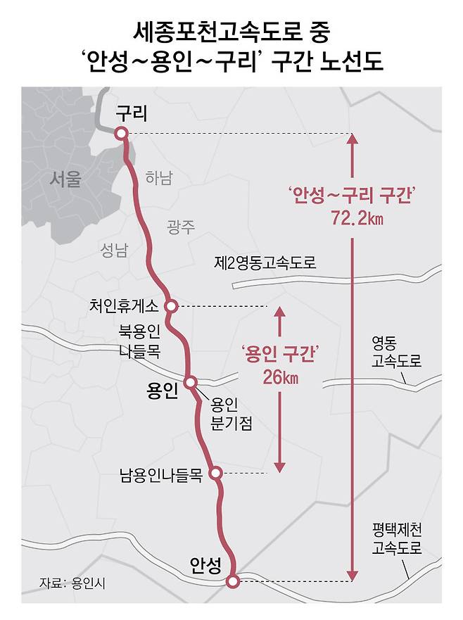 도로 개통으로 가장 큰 혜택을 보는 곳은 경기 용인이다. 경부고속도로 상습 정체가 완화되고 위례·동탄2 같은 신도시로 이동하는 편의성이 높아졌다. ‘구리∼포천’ 구간과 이어지고, 수도권제1순환선, 올림픽대로, 강변북로 등의 접근성도 좋아져 서울, 경기 북부로 가는 길이 수월해졌다. 평택∼제천고속도로와 연결돼 충청권 이동도 한결 나아졌다.