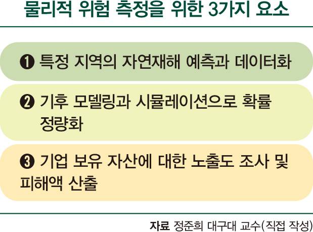 물리적 위험을 측정하기 위해서는 3가지 요소가 필수적이다. 첫째, 특정 지역에서 발생할 수 있는 자연재해를 예측하고 이를 데이터로 정리해야 한다. 과거 기상 데이터를 기반으로 지역별 자연재해 발생 가능성을 분석하는 과정이다. 둘째, 앞서 예측한 재해 발생률을 계산한다. 기후 모델링과 시뮬레이션 기술을 활용해 이러한 확률을 정량화한다. 셋째, 기업이 보유한 자산이 앞선 측정한 자연재해 및 발생률에 얼마나 노출되었는지를 분석해 예상 피해액을 산출한다. 기업의 시설, 장비, 재고 등이 자연재해에 얼마나 취약한지 정밀하게 평가하는 작업이다.